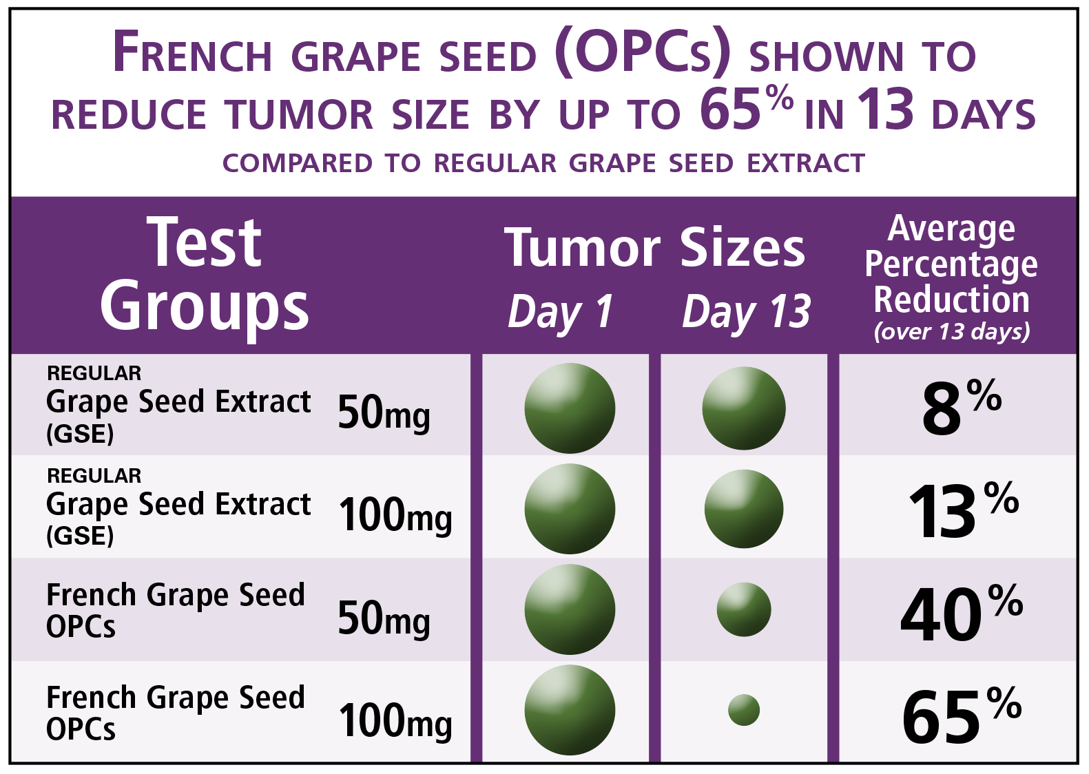 Additional research on this same French grape seed has found that being standardized for low molecular weight OPCs. Compared to a grape seed extract that was not standardized for these crucial components, (unfractionated) it reduced tumor size by 65 percent versus 13 percent for the common grape seed extract in an in vivo study.